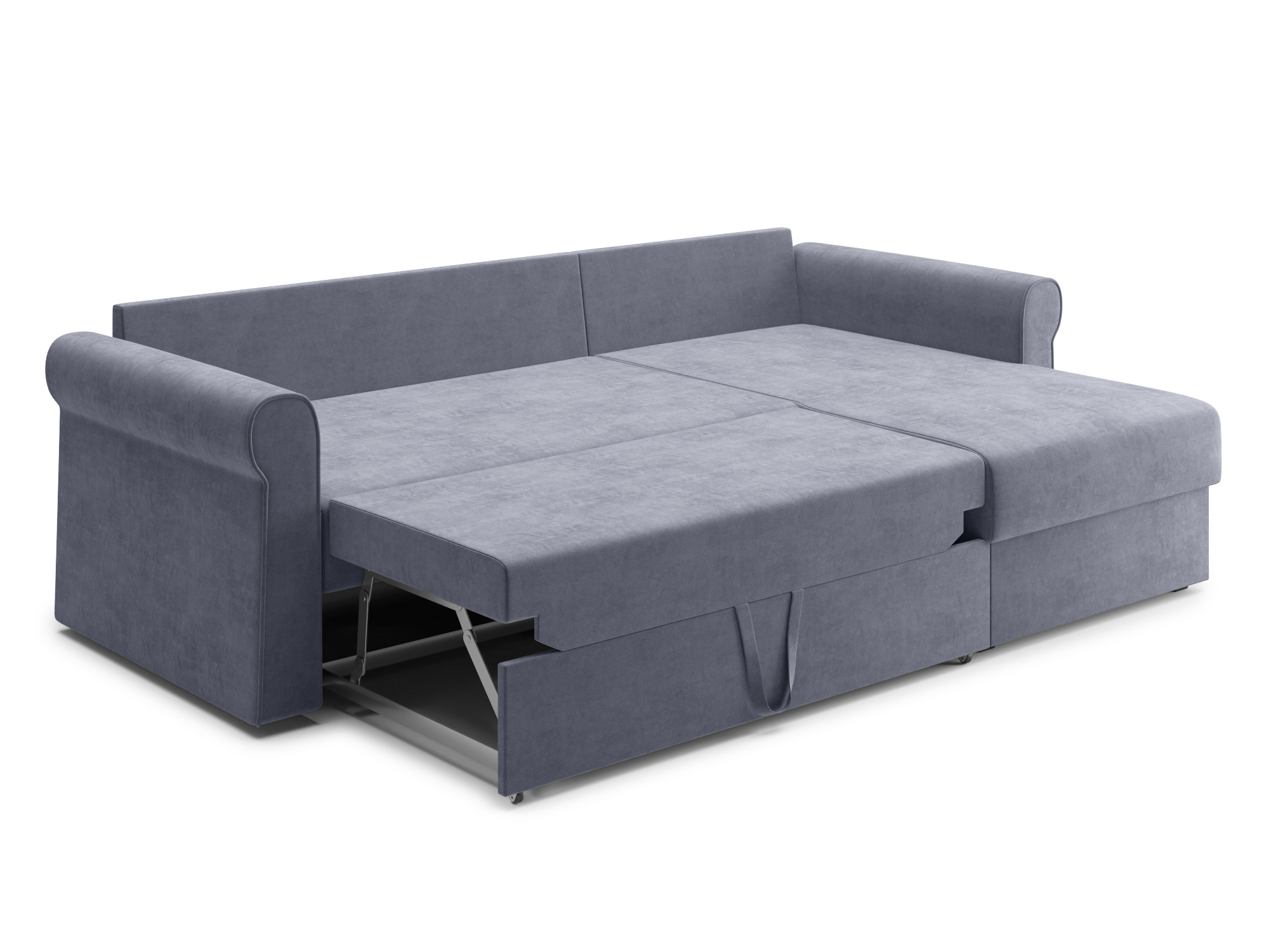 - Механизм раскладки дельфин — основан на выкатывании дополнительной платформы, скрытой под сидением дивана. Чтобы разложить диван, нужно потянуть за специальные ремешки, помогающие перемещать элементы конструкции. В результате этого действия нижняя часть дивана начнёт перемещаться. Делать это нужно до тех пор, пока часть не выдвинется максимально вперед. Затем следует немного приподнять элемент и упереть в противоположную часть, которая осталась неподвижной. Под сиденьем дивана находится короб для хранения вещей и постельных принадлежностей.