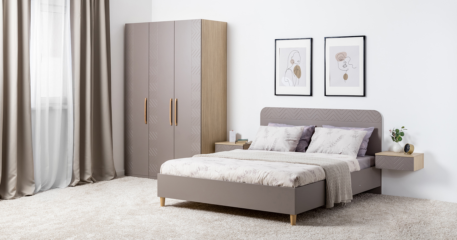 Подвесные консоли и велюровый пуф в тон фасадов дополняют сдержанный и благородный облик спальни Амьен.
