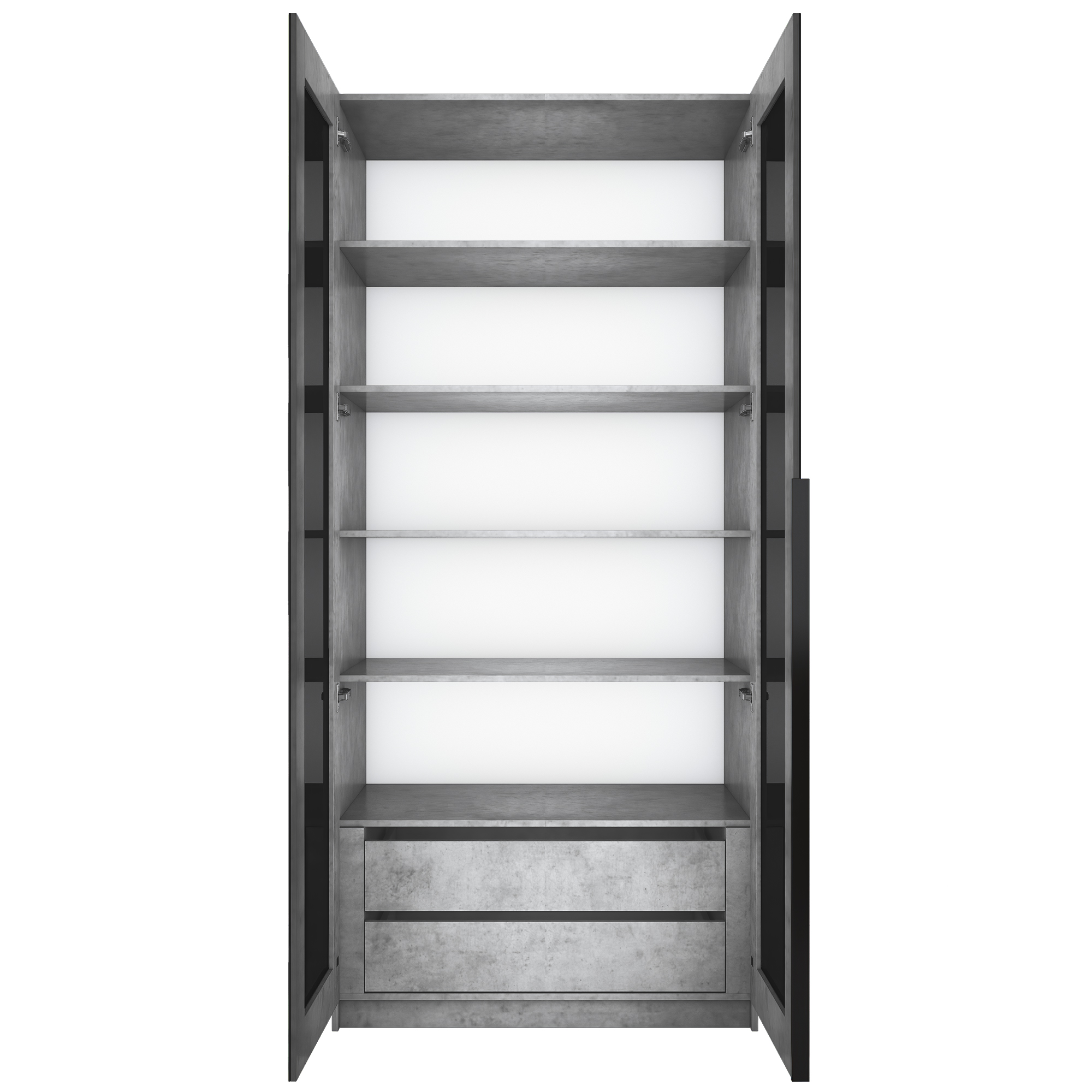 Фасады шкафа изготовлены из стекла черного цвета, оклеенного противоосколочной пленкой с внутренней рамкой из ЛДСП Бетон.