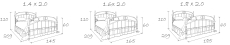 Размеры спального места (ДхШ) 2000х1800, высота изножья 600 мм, максимальная нагрузка на 1 спальное место - 150 кг.