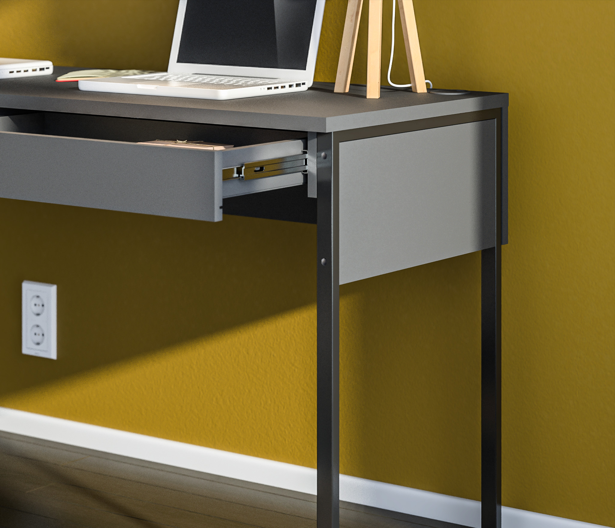 У стола имеется специальная заглушка для проводов, которая позволяет аккуратно спрятать провода от компьютера, лампы или других устройств.